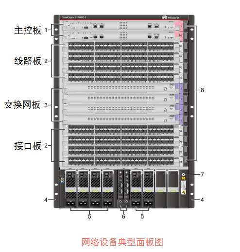 为方便理解网络设备内部的各个功能模块,以S12700E-8为例讲解典型网络设备的构架: