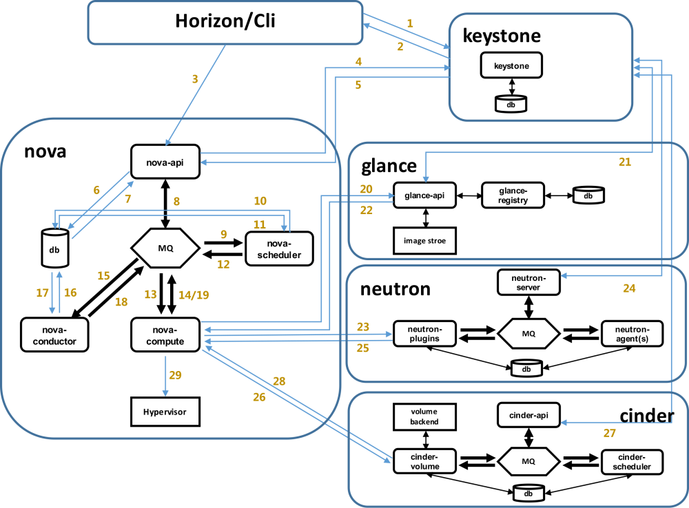 1. 客户(可以是 OpenStack 最终用户 ,也可以是其他程序)向 API(nova-api)发送请求:“帮我创建一个虚机”