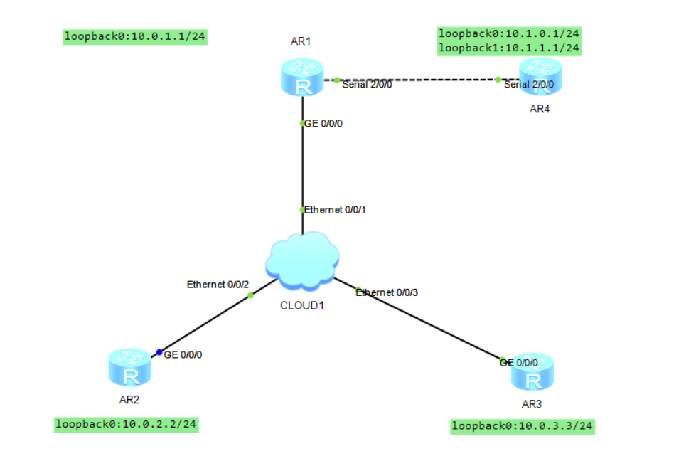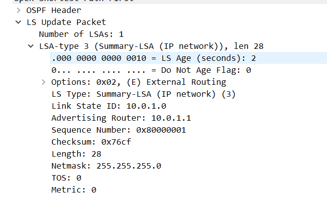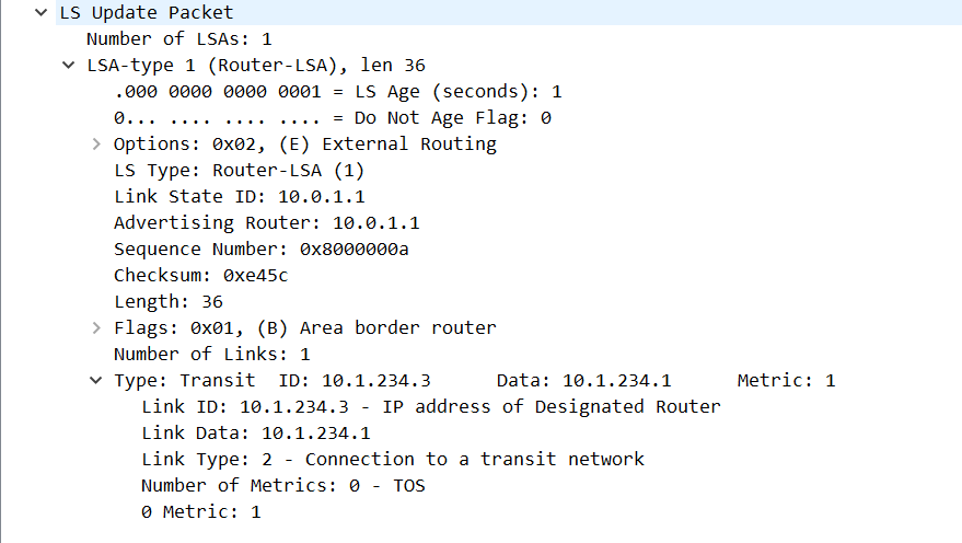 此处以AR1为例,在AR1设备的G0/0/0口抓包可以看到 ,AR1设备通过updata消息将自己的两个接口信息进行了描述(G0/0/0口和loopback接口)
