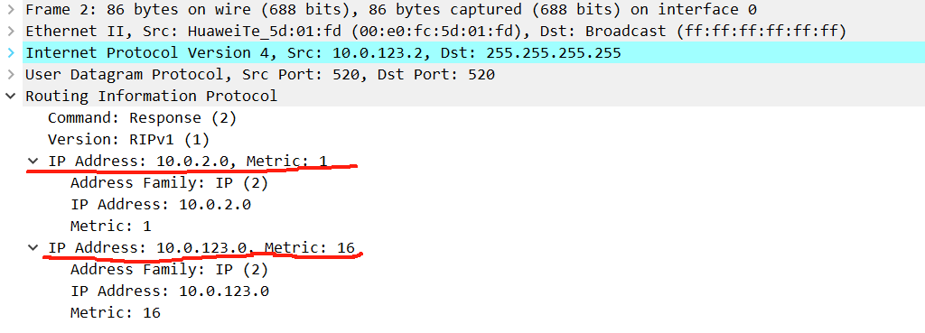 运行距离矢量路由协议的设备会周期性的泛洪自己的路由表 。通过在AR2的G0/0/2口抓包可以看到如下图的数据