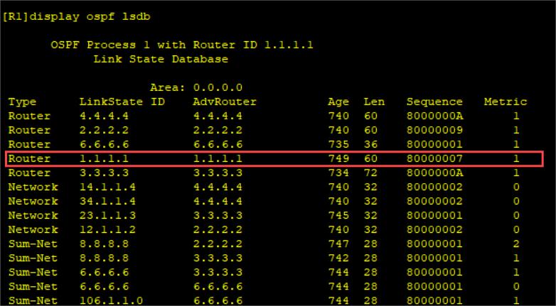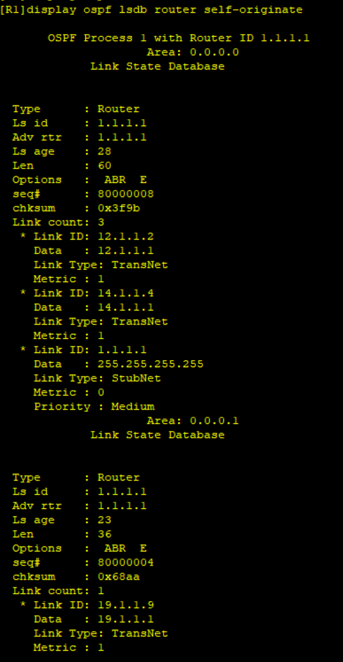 区域1中的LSA则只描述了GigabitEthernet0/0/0的链路状态和接口信息 。观察完这些信息,我想大家应该是能够理解router lsa的描述信息了吧(每个设备都会产生 ,描述了设备的链路状态和开销,该LSA只能在接口所属的区域内泛洪),依此内推 ,那么在区域1中我们应该可以看到AR1-4所产生的总计四条1类LSA(图中还有一条6.6.6.6产生的1类LSA,此处因为有虚链接。此处大家可以自行去观察一下这条LSA的具体信息。)
