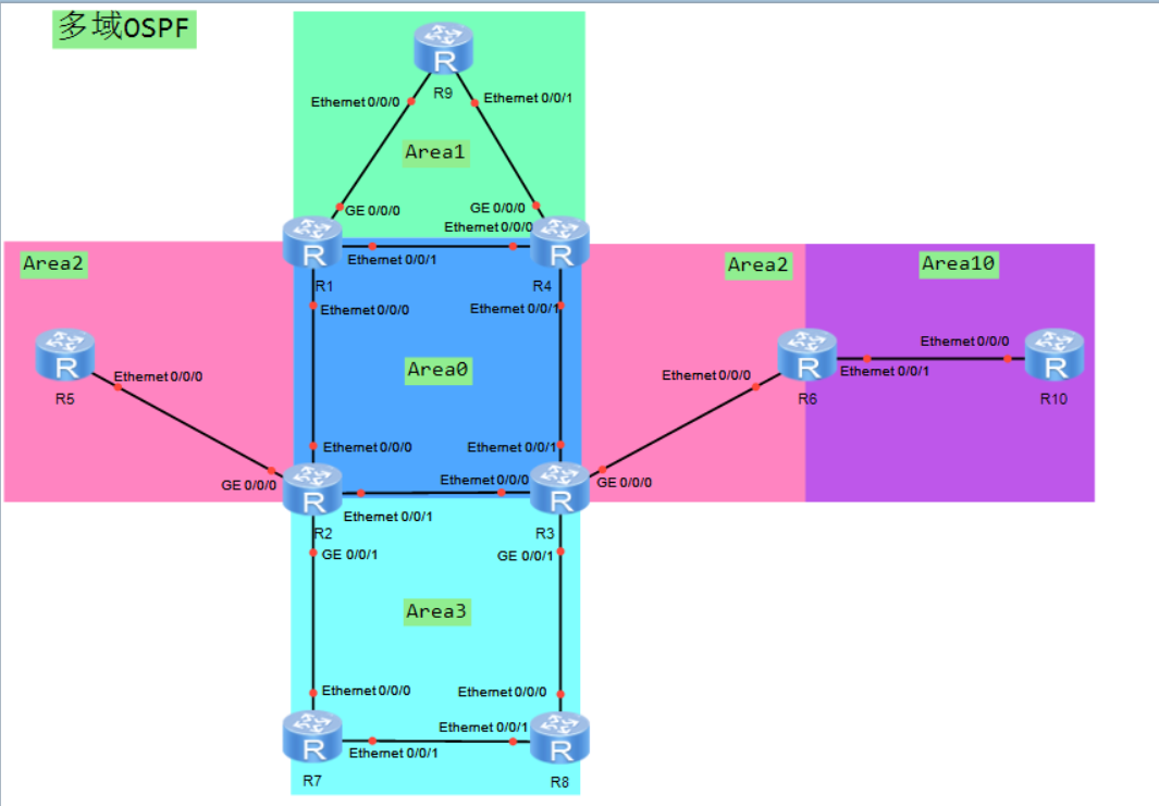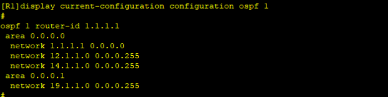 通过配置发现我们将Ethernet0/0/0.thernet0/0/1以及LoopBack 0 通告到了骨干区域(区域0) GigabitEthernet0/0/0口通告到了区域1 。