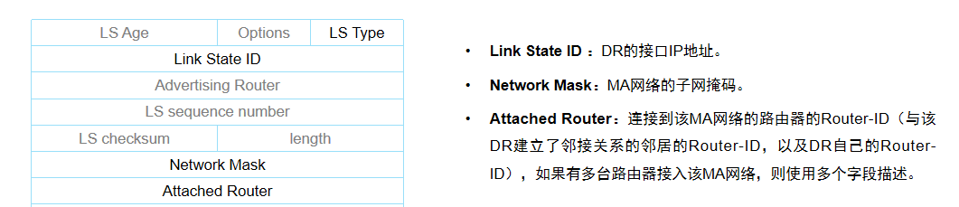 Network LSA 记录了该网段内所有与DR建立了邻接关系的OSPF路由器,同时携带了该网段的网络掩码。