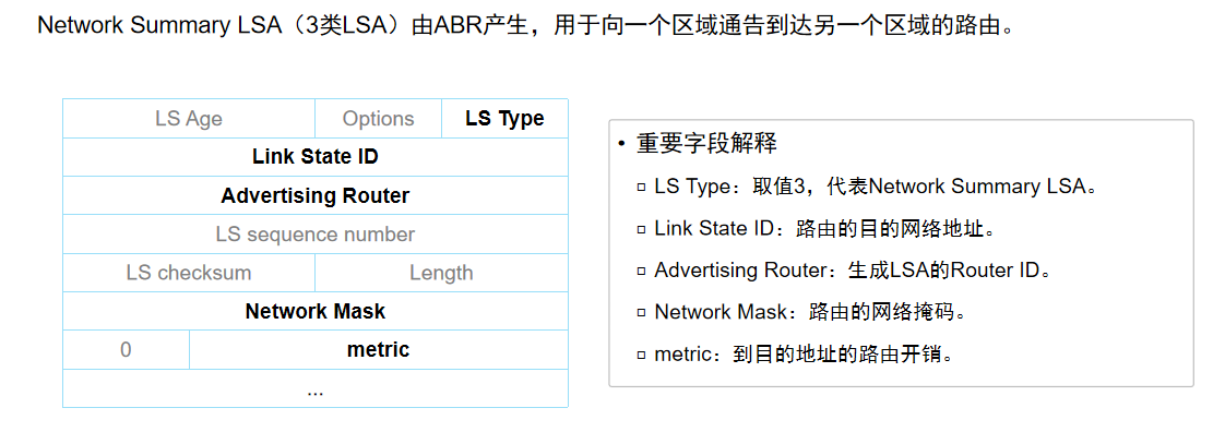 大家可以看到3类LSA所携带的信息很简单 ,就是路由信息,这里是不是有点距离矢量路由协议的味道呢?