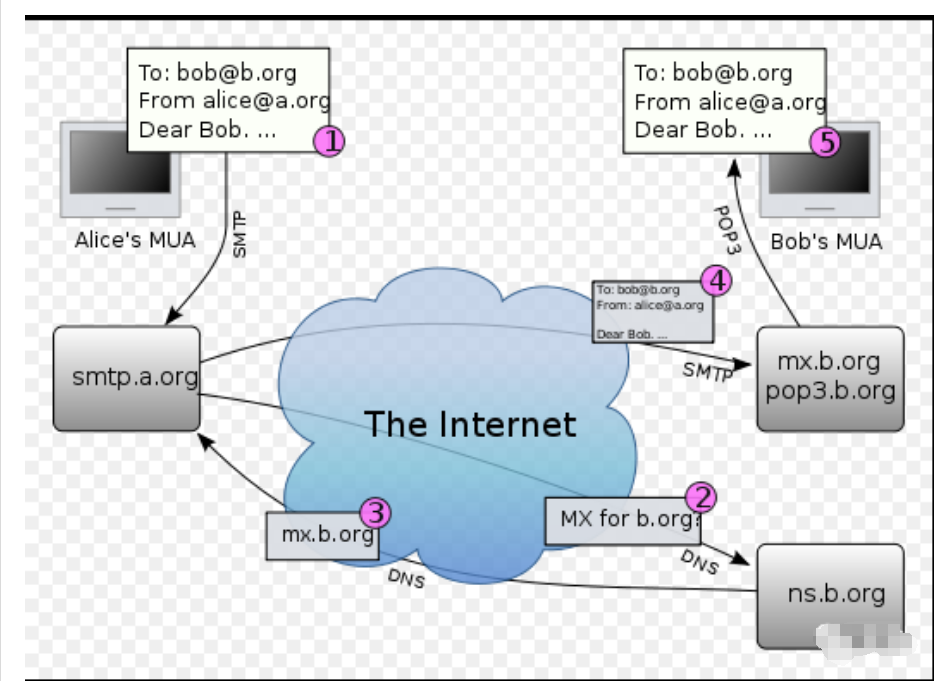 MTA邮件传送代理,服务器接收到MUA发送过来的邮件 ,MTA通过目标域名判断该邮件的发送到本地域,还是其它域,如果是本地域 ,就把该邮件交给MDA处理;如果是其它域,向DNS查询该域的MX记录,获得目标服务器的IP地址 ,然后将该邮件通过SMTP协议传送到目标邮件服务器。